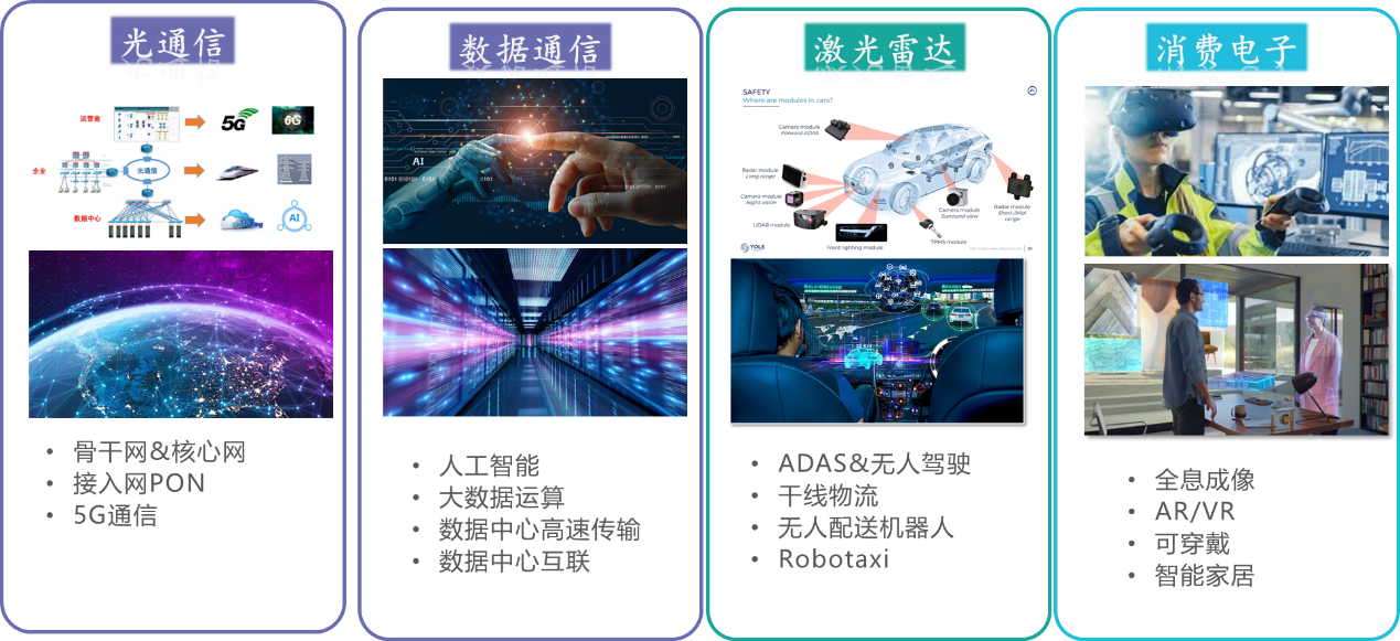 公司主营业务为三五族化合物半导体外延片和高端半导体光电芯片的自主研发与生产,核心团队全面掌握了芯片设计、外延生长、芯片制程、封装与测试等关键技术。现已构建了基于砷化镓与磷化铟衬底的芯片自主研发生产平台,可生产光通讯用全波段芯片。产品涵盖高速DFB、高速VCSEL、高速EML、高速PD/APD,以及多结VCSEL与多结EEL等,广泛地应用于人工智能、5G光通信、数据中心、物联网、激光雷达、3D感测与成像、智能终端、工业智(制)造等领域。